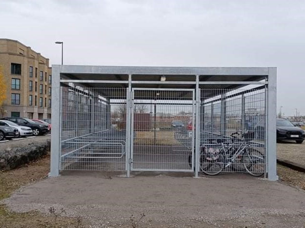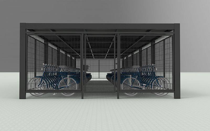 L'accès à l'abri à vélos peut être réalisé à l'aide d'une large porte coulissante robuste ou d'une porte tournante qui peut être ouverte à l'aide d'une serrure ou d'un système de badge.