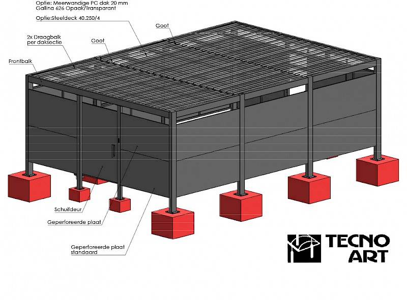 Un module de base est élaboré comme un modèle de table avec 4 supports robustes (tubes 200x100). Le toit est constitué d'un tablier en acier et peut, en option, être recouvert d'un toit vert.